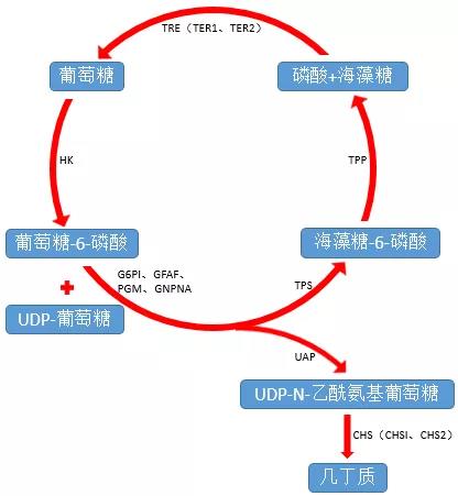 多糖合成几丁质的过程主要由海藻糖水解酶(Trehalase, TRE)和几丁质合成酶(Chiitin Synthase, CHS)在内的多种酶共同参与合成,主要分为以下几步:
