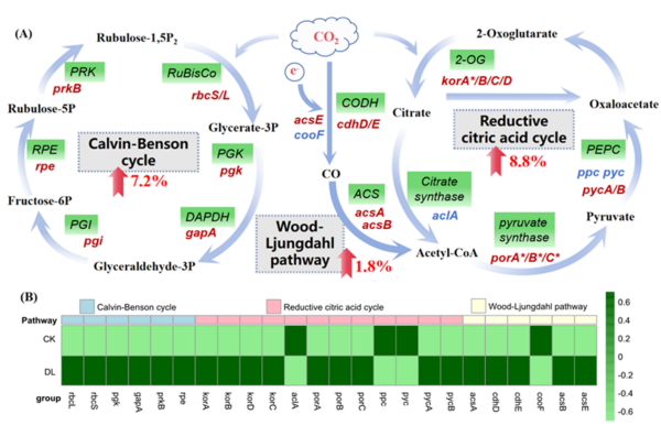随着全球气候变化和土地退化问题的加剧,盐碱化土壤面积持续扩大,严重制约了生态系统碳汇功能。引入外源固碳微生物是提升土壤碳汇功能的一种有效途径。然而,针对固碳微生物在盐渍化环境下的应用研究还较少,耐盐碱固碳微生物促进土壤有机碳固存的机制尚不明确。针对这一问题,中国科学院东北地理与农业生态研究所水环境污染与防治研究团队自滨海湿地分离获得了一种耐盐碱固碳菌(Glutamicibacter halophytocola DA1),将其接种于盐碱土壤中用以提升土壤固碳能力,并系统阐明了其在盐碱胁迫环境下的固碳机制。