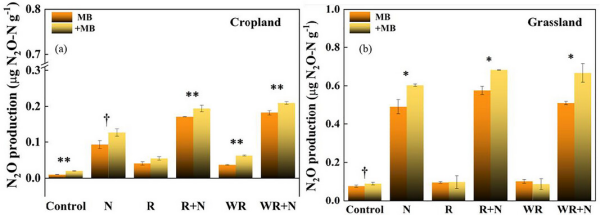 为破解这一科学难题,研究团队选取了源自同一母质但土壤基质存在差异的农田土壤和草地土壤,通过葡萄糖预培养调控微生物量大小,随后添加不同碳氮比的黑麦草残体(低碳氮比)和热水浸提黑麦草残体(高碳氮比),并设置施氮与不施氮处理,探究了微生物量大小、外源碳氮输入对不同土地利用类型N₂O排放的影响。研究发现,在无外源碳氮输入条件下,微生物量的增加使农田土壤和草地土壤的N₂O排放量分别提升 105% 和 18%,证实了微生物量大小是调控N₂O排放的关键因子(图1)。不同土地利用类型对碳氮输入的响应存在显著差异:农田土壤中,高碳氮比黑麦草残体与施氮结合处理的N₂O排放量最高;而草地土壤则在低碳氮比黑麦草残体与施氮组合下排放量最大。