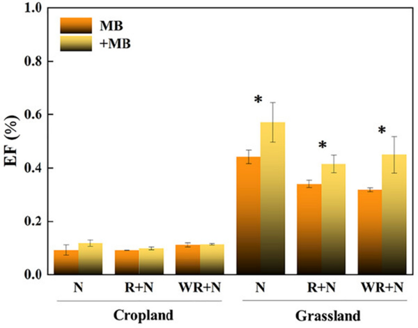 图2土壤微生物量大小和植物残体添加对农田和草地土壤氧化亚氮排放因子(EF)的影响