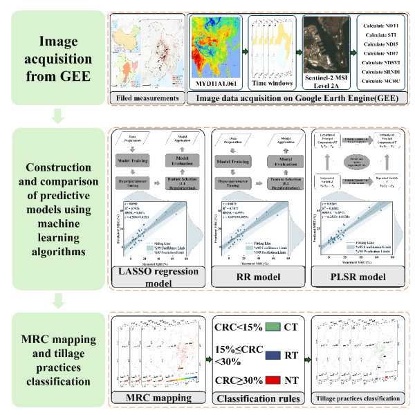 中国科学院东北地理与农业生态研究所遥感中心杜嘉高级工程师及其团队以东北玉米种植区为研究区,利用多种机器学习算法和Sentinel-2 MSI影像构建了玉米秸秆覆盖度(MRC)反演模型并全面比较了各模型预测性能(图1)。