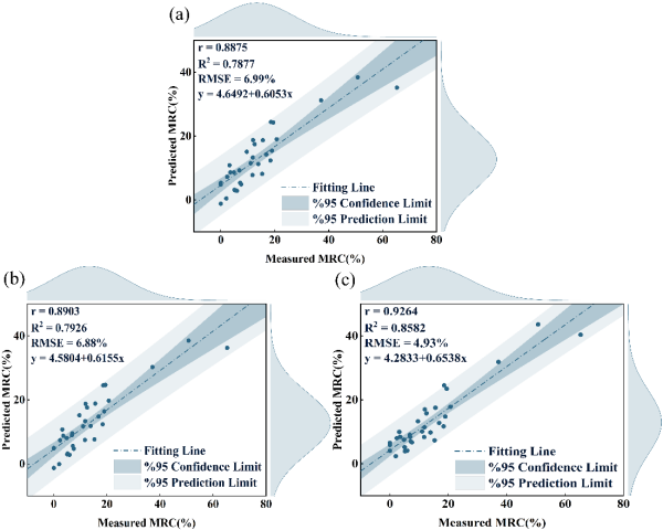 研究发现,基于Lasso回归(Lasso)、岭回归(RR)和偏最小二乘(PLSR)三种机器学习算法构建的MRC反演模型中,PLSR展现了更优的预测性能,其决定系数(R2)和均方根误差(RMSE)分别为0.8582和4.93%(图2)。
