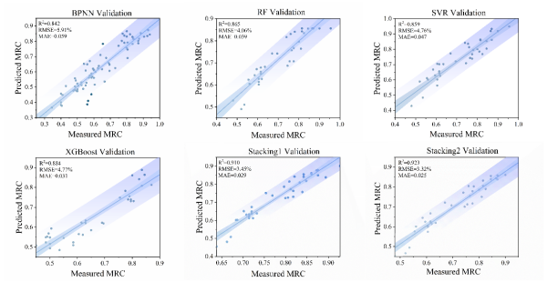 此外,研究人员对比评估了在松嫩平原南部利用经典的单一机器学习算法神经网络(BPNN)、随机森林(RF)、支持向量机回归(SVR)、极限梯度提升(XGBoost)和集成学习Stacking1、Stacking2构建的MRC反演模型性能。结果表明,Staking集成学习模型展示了更优的预测性能。其中Stacking2的预测精度最高,R2、RMSE和平均绝对误差(MAE)分别达到0.923,3.32%和0.025 (图3)。