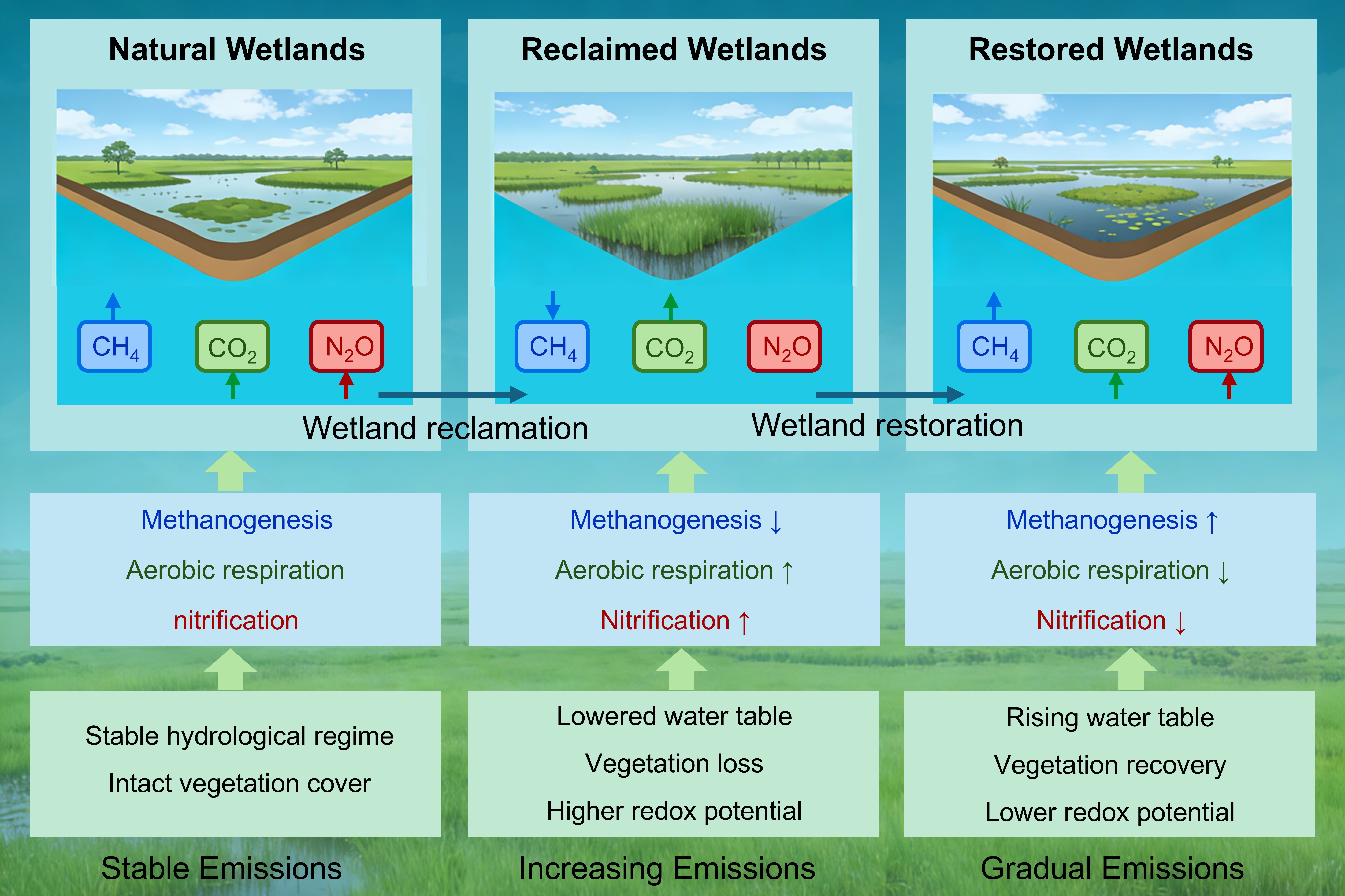 研究发现:湿地开垦会增强碳排放,使CO2排放平均增加213.53 g C m-2 yr-1,并使CH4排放降低10.99 kg C ha-1 yr-1,表明湿地向农田或草地转化会导致碳汇转变为碳源;湿地恢复则降低CO2和N2O排放,分别平均减少160.16 g C m-2 yr-1和6.45 kg N ha-1 yr-1,但在恢复初期会引起CH4排放短期增加(15.61 kg C ha-1 yr-1)。相比之下,湿地保护对温室气体排放的影响相对较小。时间动态分析显示,湿地恢复过程中CH4排放呈现“先升后稳”的非线性特征,而开垦湿地的CO2和N2O排放则表现为持续增加趋势。