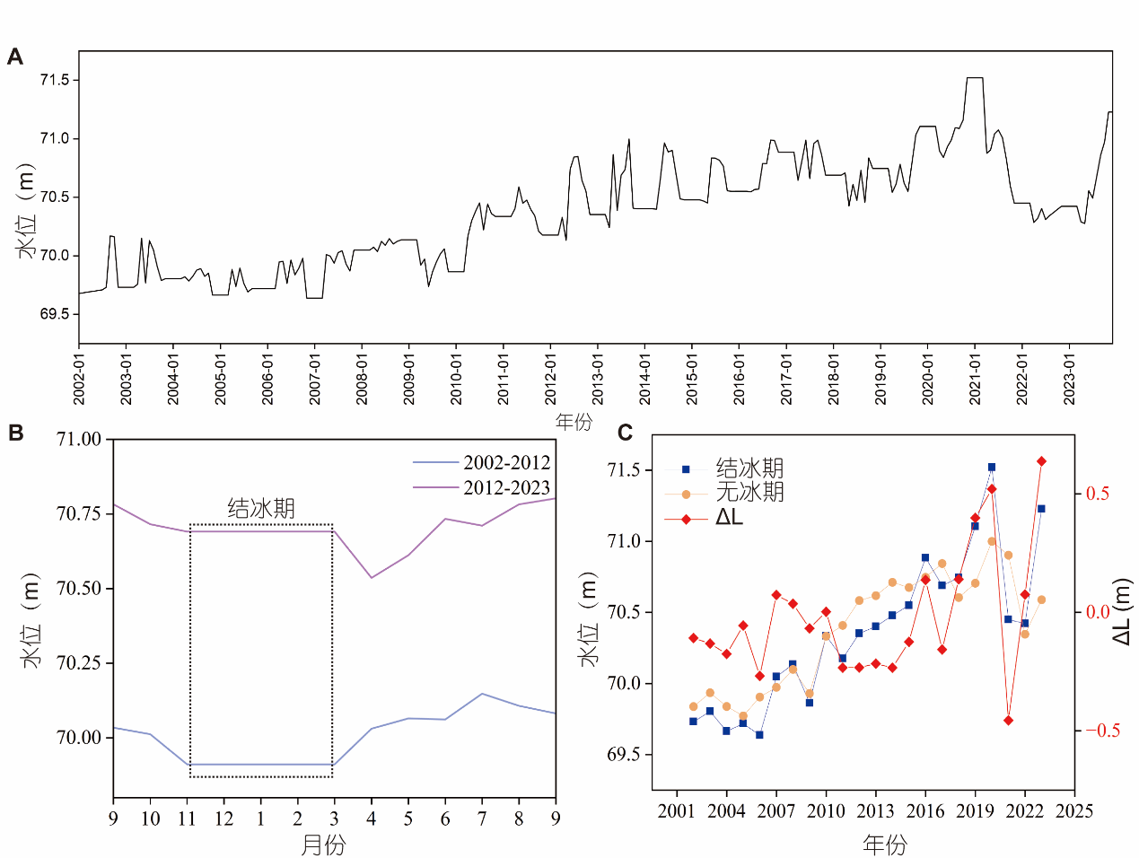 图1 兴凯湖水位变化趋势。(A)2002–2023年水位月变化;(B)2002–2012年及2012–2023年兴凯湖月均水位变化,虚线表示结冰期湖水位;(C)2002–2023年兴凯湖结冰期(11月至次年3月)与无冰期(4–10月)的年均水位变化,红色实线代表无冰期与结冰期水位差的年变化(前者减去后者)。