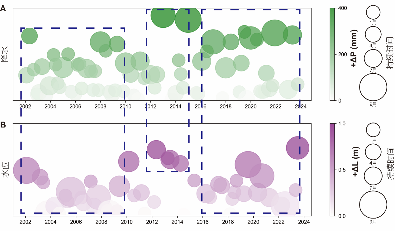 图3 2002–2023年兴凯湖流域连续降水增加事件变化与湖泊水位波动之间的关系。(A)兴凯湖流域连续降水上升事件的幅度与持续时间;(B)兴凯湖水位连续上升事件的幅度与持续时间。蓝色虚线框表示降水(或水位)显著增加且持续时间较长的时期。+ΔP表示连续降雨增加时期内事件的极大值与极小值之差;+ΔL表示湖水位连续上升时期内的事件极大值与极小值之差。每个阴影圆表示一次独立的连续降水增加事件或水位上升事件。圆圈的大小表示事件的持续时间,颜色深浅表征降水或水位的峰值增幅。需要注意的是,图中圆圈的重叠是可视化的展示,并不意味着事件同时发生。气泡越大表示持续时间越长;气泡颜色越深表示水位或降水的峰值增幅越大。