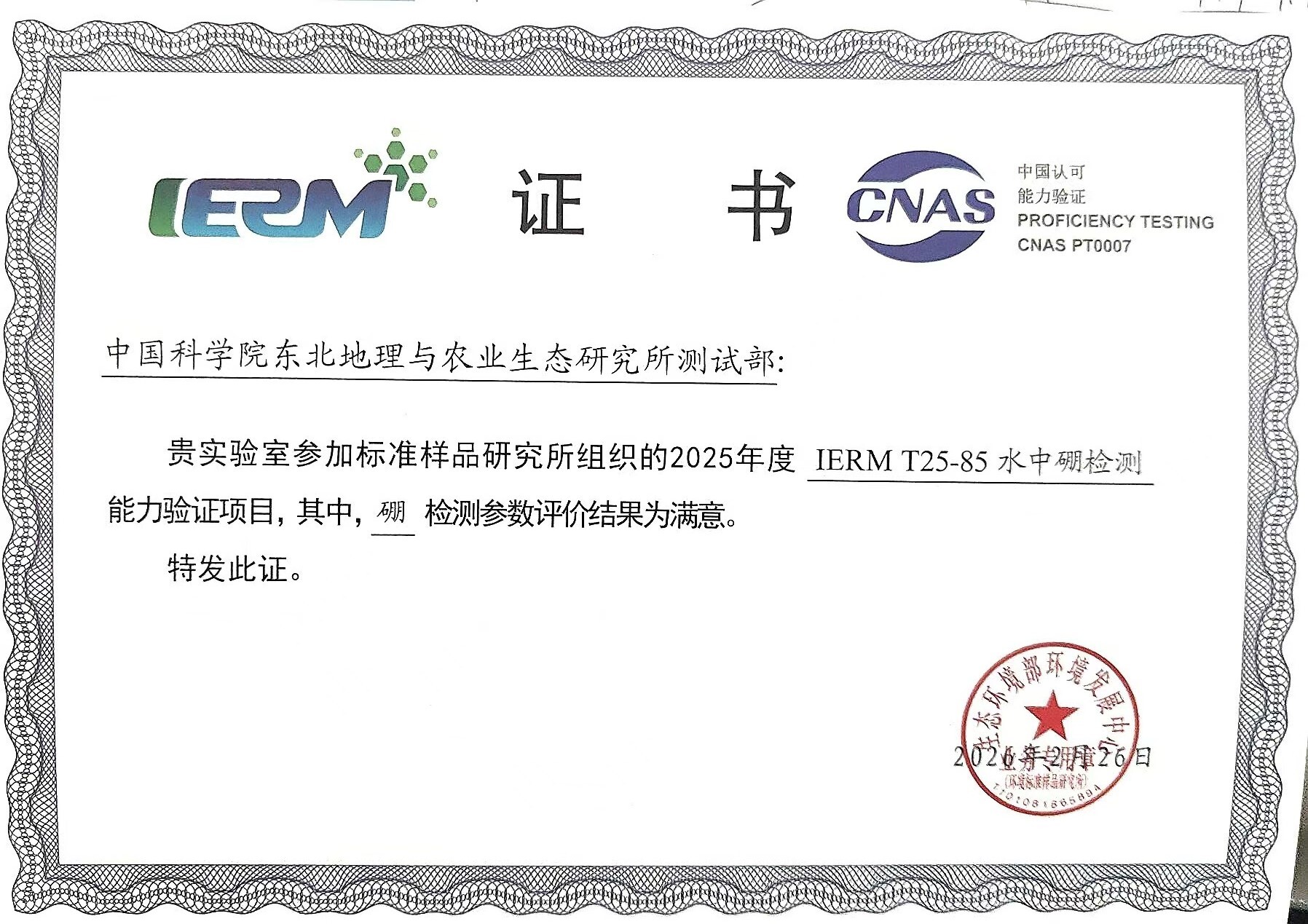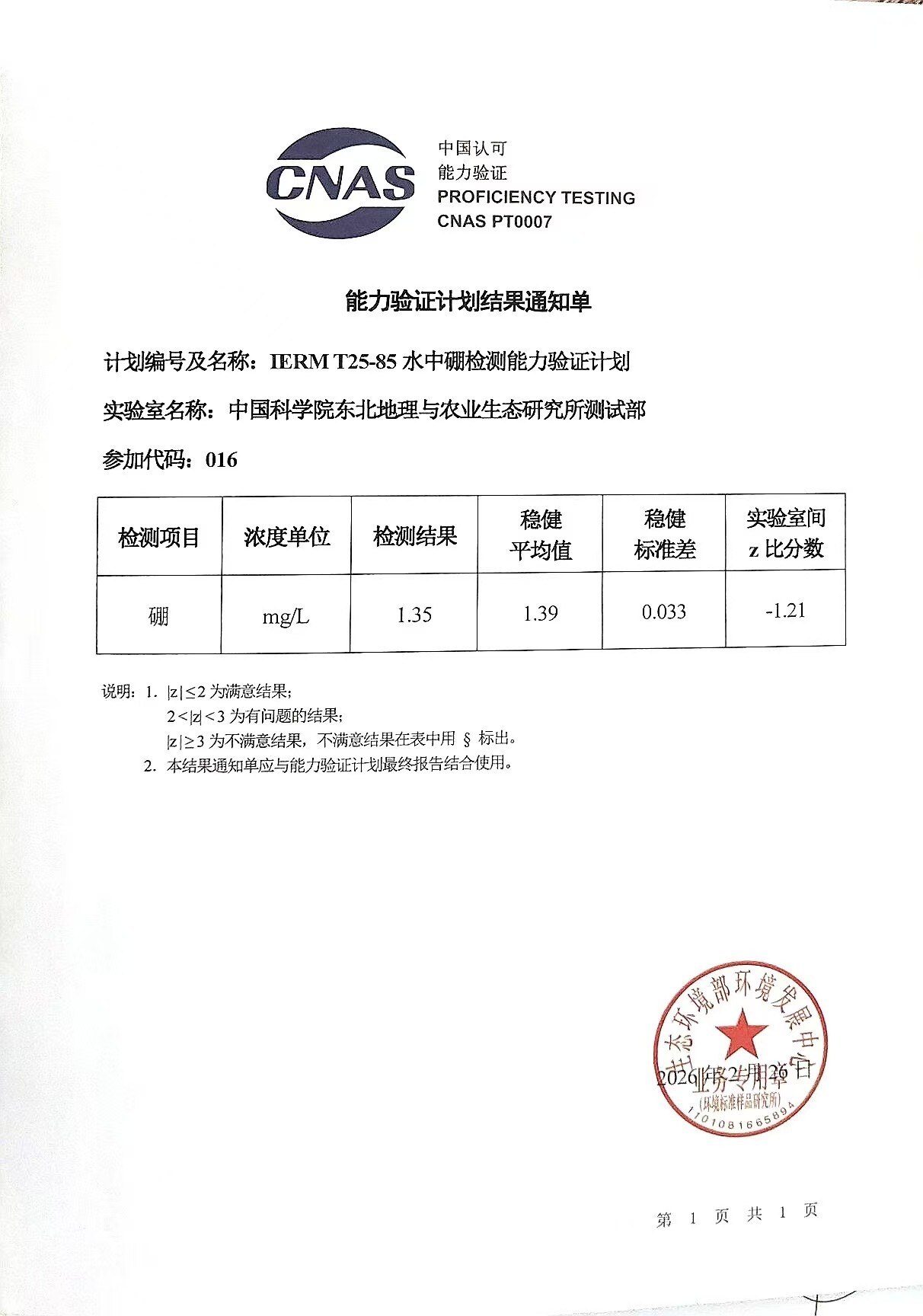 为提升检验检测技术能力,确保分析测试部数据准确可靠,分析测试部积极参加国家和社会组织承办的实验室能力验证项目。2025年度参加生态环境部环境发展中心组织的测量审核:水中硼检测能力验证,获得满意结果。