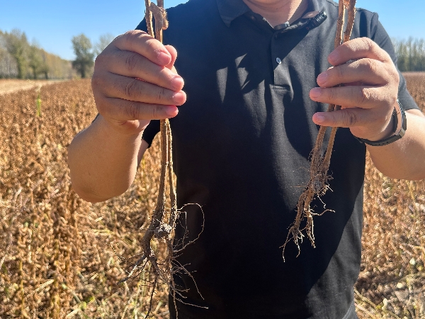 “这粒肥料的妙处在于既‘节本’又‘护土’,还能‘增产’,你看两组田大豆的根系深度都不一样,处理组大豆的根系更长。”东北农业大学资源与环境学院教授姜佰文解释说,硅钙镁硫等中量元素,恰好补上了长期施用“老三样”造成的土壤养分缺口,像给作物根系“搭了脚手架”,刺激根系发育的同时,还能增强作物抗病抗逆能力;而微生物与矿质元素的协同作用,不仅提高了肥料利用率,减少30%化肥用量,其保肥保墒的特性更让板结的黑土地慢慢恢复“元气”。