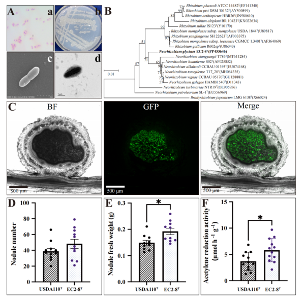 图1 (A) 菌株EC2-8T表型特征。革兰氏染色(a),菌落在YMA培养基生长形态(b),扫描电镜(c),透射电镜(d);(B) 基于16S rRNA基因序列构建的系统发育树;(C) 荧光标记菌株EC2-8T侵染大豆根瘤,图像拍摄于接种后14天,比例尺:100微米。BF,明场图像;GFP,GFP荧光;Merge,GFP和明场图像的叠加;(D–F) 接种菌株EC2‐8T和USDA110T对大豆部分生长指标的影响:根瘤数量(D),根瘤鲜重(E),乙炔还原活性(F)。P < 0.05