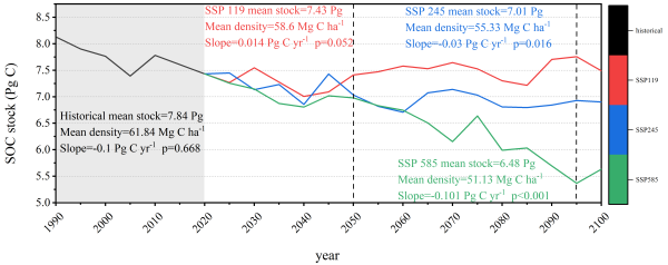 研究结果表明:(1)东北地区历史碳损失明确,1985-2020年间,东北黑土区表层SOC密度平均下降5.51 Mg C/ha,整体呈现“碳源”效应。(2)未来命运取决于排放路径, 到2100年,在高排放路径(SSP585)下,SOC储量将持续流失1.8 Pg;而在低排放路径(SSP119)下,SOC储量则有望小幅增加0.058 Pg,并出现多次碳汇/碳源转换的动态波动。(3)耕地与林地是调控关键,未来SOC变化由耕地和林地主导。耕地扩张与管理不善是导致碳损失(碳汇转碳源)的主要因素,而林地的保护与恢复则是促进碳回收(碳源转碳汇)的关键。高碳储量的生态系统(如林地、草地)对气候变化更为敏感,面临更高的碳损失风险。这项研究不仅量化了不同发展路径下黑土碳库的响应,更指明了生态恢复与土地管理在维持碳平衡中的决定性作用。