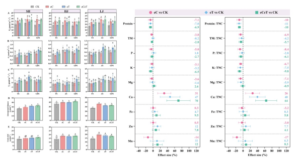 研究首先揭示了作物产量对气候变化响应的复杂性。不同大豆品种对高大气CO2浓度的产量响应存在巨大差异,其核心机制并非简单的光合速率差异,也取决于植株对非结构性碳水化合物的代谢与再分配效率。高产响应型品种能将光合优势高效转化为实际产量,而低响应品种则因“源-库”关系失衡,限制了产量潜力(图1)。同时,研究发现在高纬度东北冷凉地区,适度增温与CO2升高共同作用可使水稻平均增产23%,且增温并不会削弱高CO2的施肥效应,这与在全球其他区域普遍担忧的“增温减产”趋势形成了鲜明对比。然而,研究同样揭示了产量提升背后不容忽视的另一面——作物营养品质的显著下降(图2)。大气CO2浓度导致的碳水化合物在籽粒中的大量积累,对蛋白质和矿质元素产生了显著的“稀释效应”。在高CO2环境下,水稻籽粒的蛋白质含量平均下降了7.2%,同时多种矿质元素含量也同步降低。值得注意的是,虽然适度增温能够部分缓解某些矿物质的流失,但无法逆转蛋白质浓度的下降趋势,这可能加剧未来“隐性饥饿”的风险。综上,未来气候变化下,东北地区作为保障国家粮食安全“稳压器”的战略地位将得到进一步加强。但与此同时,如何协同提升产量与品质,将是该区域乃至全球农业应对气候变化必须解决的重大挑战。