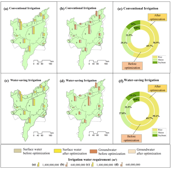 图3 水资源优化结果:(a) 优化前后常规灌溉模式下地表水配置;(b) 优化前后常规灌溉模式下地下水配置;(c) 优化前后节水灌溉模式下地表水配置;(d) 优化前后节水灌溉模式下地下水配置;(e) 优化前后常规灌溉模式下作物灌溉用水分配比例;(f) 优化前后节水灌溉模式下作物灌溉用水分配比例