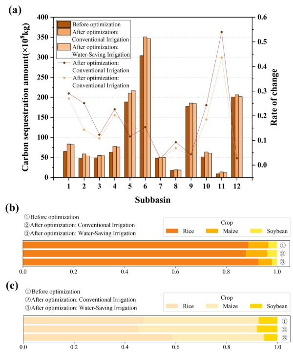 针对上述问题,本研究以中国三江平原为例,结合分布式水文模型(CWatM)和改进的基于水-碳-粮食-生态耦合的水土资源空间优化配置模型(图1和图2),实现了水资源、固碳量、粮食产量和生态系统连通性多维要素的协同与权衡。具体结果如下:(1)三江平原水资源量在156~479亿m3之间波动。由于水利工程和水土资源时空不匹配性,现有可利用水资源量无法可持续支撑三江平原4000万亩水稻田种植规模。(2)在常规灌溉模式下,优化后水稻、玉米和大豆的种植比例由现状的3:2:1调整为2.2:2.4:1.4,可节约灌溉用水23亿m3,湿地面积增加10204公顷,总固碳量可增加153亿kg,总生态效益提升102亿元,空间优化后生态连通性可提高2.8%。(3)在节水灌溉模式下,优化水稻、玉米和大豆的种植比例调整为 2.3:2.4:1.3,可节约灌溉用水45亿m3,总固碳量增加137亿kg,湿地面积增加5609ha,总生态效益提升27亿元,空间优化后生态连通性提高2.3%(图3-图5)。