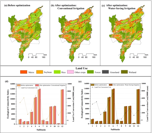 图5 空间优化配置结果:(a)优化前土地利用类型分布;(b)常规灌溉模式下优化后土地利用类型分布;(c)节水灌溉模式下优化后土地利用类型分布;(d)优化前后常规灌溉模式下生态系统连通性及转换成本变化;(e)优化前后节水灌溉模式下生态系统连通性及转换成本变化。