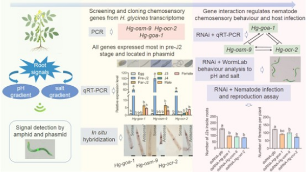 大豆孢囊线虫(Heterodera glycines)是全球范围内严重威胁大豆生产的重要病原之一,每年造成的经济损失高达数十亿美元。线虫依靠精准的化学感知系统识别寄主根部分泌的信号物质,进而实现定向定位和侵染寄主。因此,揭示线虫化感系统的分子调控机制,对于阐明其寄主识别过程及开发新型特异性杀线剂具有重要意义。