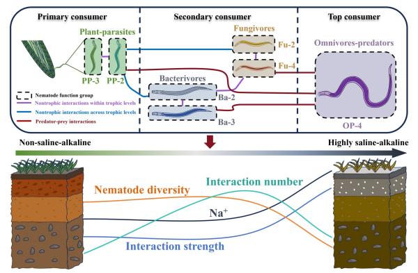 研究团队沿盐碱梯度设置了非盐碱化、弱盐碱化、中度盐碱化和高度盐碱化四个等级的土壤样点。通过将线虫按取食行为和生活史策略划分为不同功能群,并根据各功能群所处生态位进一步将功能群间的相互作用划分为三类:营养级内非营养相互作用、跨营养级非营养相互作用以及捕食者-被捕食者相互作用,系统构建了线虫功能群网络。