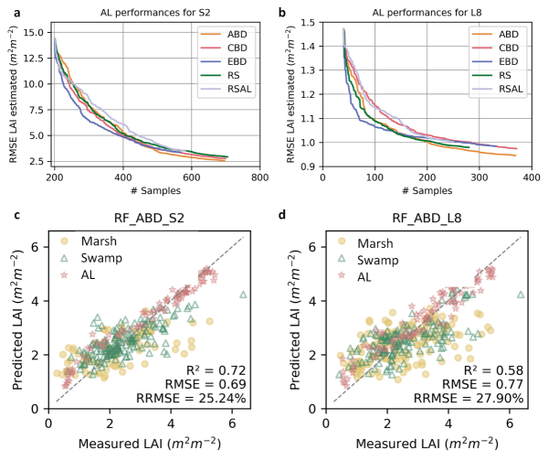 为解决上述科学问题,中国科学院东北地理所湿地遥感研究团队基于多年野外原位数据积累与多源遥感数据,率先构建了一套面向全国尺度的湿地LAI混合反演与制图方法框架,实现了我国国家尺度湿地植被生态参数、10 m空间分辨率的突破。该研究整合了2013–2023年期间我国不同湿地植被类型的865组野外实测LAI数据,通过遥感云计算平台融合多源卫星影像(Sentinel-2与Landsat-8),创新性地提出一种“物理模型+主动学习+机器学习回归”的混合建模策略。通过经典辐射传输模型(PROSAIL-5B)增强模型可解释性,采用主动学习技术优化训练样本分布,缓解病态反演和样本冗余问题,提高复杂湿地生物群系下的模型泛化能力,结合随机森林机器学习算法建立高效稳健的LAI反演模型。