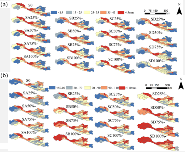图 2. 流域生态系统退化情境下水文服务功能变化。(a)、(b)、(c)、(d)分别表示基准情景(S0)和不同生态系统退化情景(SA−、SB−、SC−、SD−)下各子流域的单位面积水源涵养量、单位面积产水量、洪水发生月数以及干旱发生月数。SA、SB、SC 和 SD 分别代表森林、草地、湿地和综合生态系统格局的变化;25%−、50%−、75%−和 100%−分别表示生态系统面积减少 25%、50%、75% 和 100%。SA25%−表示 25% 的森林退化。
