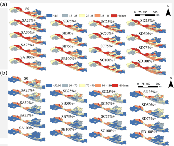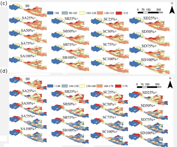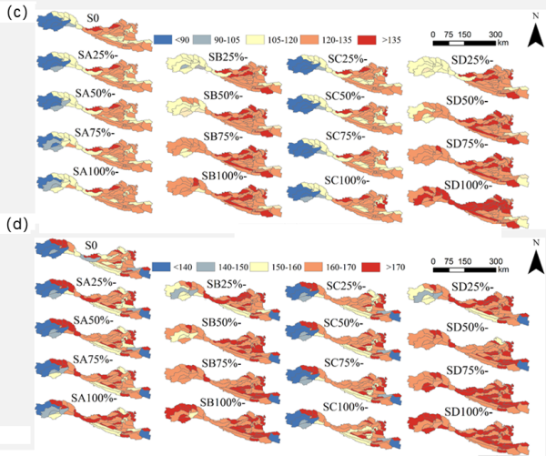 图 3.流域生态系统恢复情境下水文服务功能变化(a)、(b)、(c)、(d)分别表示基准情景(S0)和不同生态系统保护情景(SA+、SB+、SC+、SD+)下各子流域的单位面积水源涵养量、单位面积产水量、洪水发生月数以及干旱发生月数。SA、SB、SC 和 SD 分别代表森林、草地、湿地以及综合生态系统;25%+、50%+、75%+ 和 100%+ 分别表示 25%、50%、75% 和 100% 的裸地转化比例。SA25%+ 表示将 25% 的裸地转化为森林。