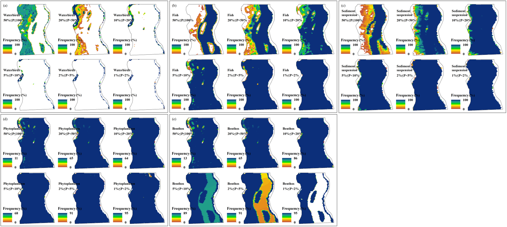 图2 洪泛湿地潜在生境的空间分布 (a) 水鸟;(b) 鱼类;(c) 泥沙悬浮物;(d) 浮游植物;(e) 底栖动物(频率是指某一区域适宜特定物种生存的天数占该特定洪水频率发生总天数的比例)