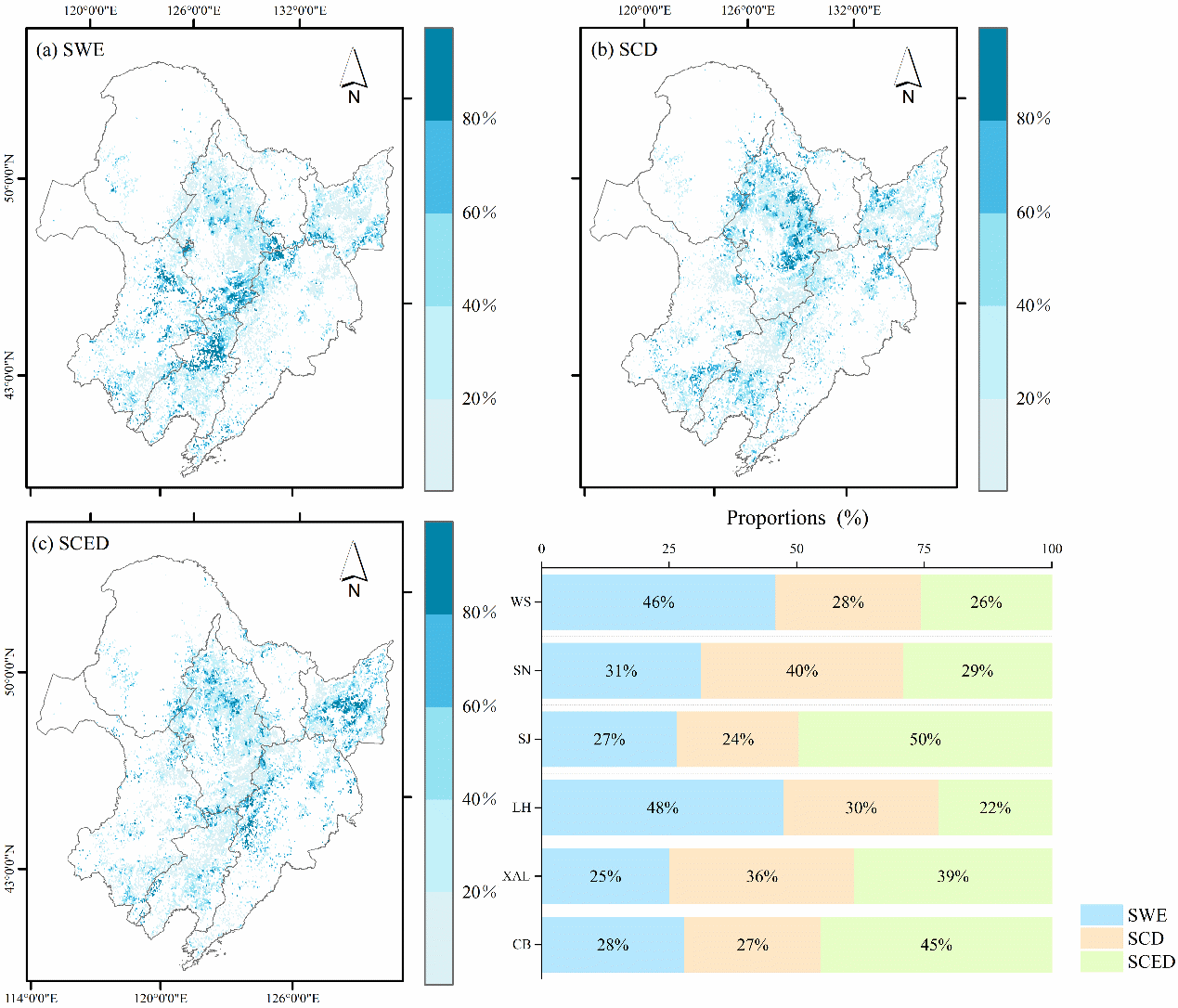 图1 基于岭回归的东北地区不同农业区积雪对旱田GPP的贡献,SWE、SCD和SCED分别为雪水当量、积雪日数和融雪终日