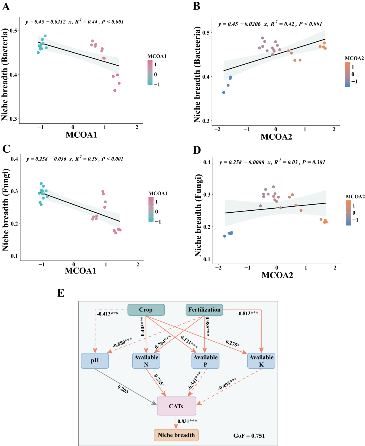土壤微生物群落聚合性状分析显示,长期化肥施用使三种作物种植系统土壤微生物群落对复杂有机物质的降解能力减弱,其中玉米和大豆连作土壤中的微生物功能更偏向环境响应,而小麦连作土壤中的微生物功能更偏向养分循环,且小麦对长期施肥更为敏感(图2)。进一步分析发现,化肥施用和作物类型可通过改变土壤氮、磷、钾养分状况调控微生物群落聚合性状,进而影响微生物生态位宽度(图3)。本研究揭示了长期化肥施用条件下不同作物种植系统土壤微生物生态功能重组的内在机制,为优化黑土区施肥管理、维持土壤微生物生态功能稳定性和促进农业可持续发展提供了新的科学依据。