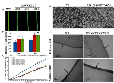 扫描电镜与透射电镜显示GsWRKY20促进蜡质晶体合成,形成更厚角质层