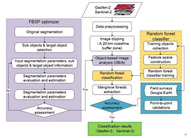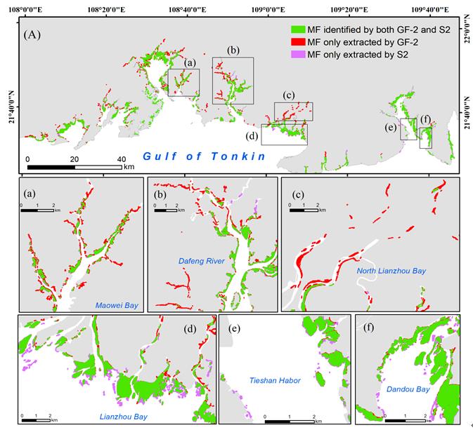 研究人员选取广西沿海为研究区域,利用面向对象结合随机森林的方法分别以高分-2号和哨兵-2号影像为数据源提取红树林,绘制了广西红树林空间分布图,分别对比两种数据应用于大尺度红树林制图的优势和不足。得出结论,低潮时期,高分-2号刻画出的斑块边界更为清晰,提取的红树林总体精度更高;哨兵-2号影像具有提取高潮水淹红树林的能力,并且能够准确的区分红树林和内陆森林,总体分类精度较高。