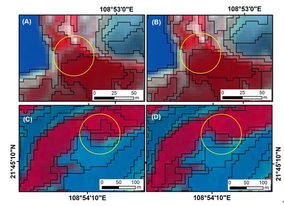 图2 影像分割中普通分割和最优分割结果对比。(A)高分-2号影像的普通分割结果;(B)高分-2号影像的最优分割结果;(C)哨兵-2号影像的普通分割结果;(D)哨兵-2号影像的最优分割结果。