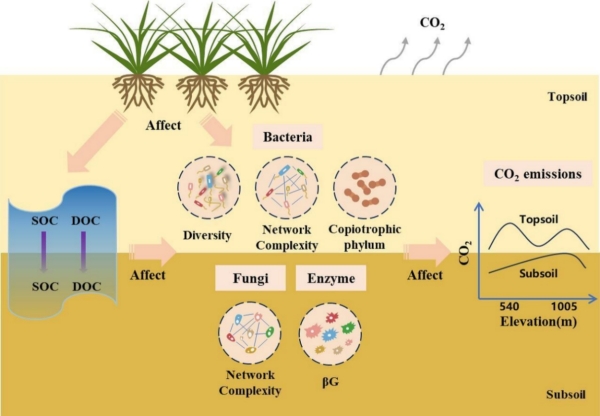 探究全球气候变化下泥炭地土壤碳库稳定性对于预测未来陆地碳排放具有重要意义。然而,人们对山地泥炭地不同海拔梯度和土层上碳排放模式及其调控机制仍不清楚。因此,本研究选取了长白山327-1485m的五个具有代表性的泥炭地,通过测定气候、土壤、植被及微生物,旨在阐明泥炭地土壤CO2排放模式及其调控机制。研究发现,泥炭地土壤CO2排放在海拔梯度上呈现非线性响应。表层土的CO2排放在540m和1005m出现峰值,而亚表层土的排放在1005m达到最大。这说明,海拔梯度上碳的排放并不是遵循简单的线性或单峰的模式。这种非线性模式是由不同的微生物功能属性主导的。表土的CO2排放主要受细菌群落的属性(如物种多样性、网络复杂性和富营养型菌门)调控。相比之下,亚表层土的CO2排放则主要由真菌网络复杂性和胞外酶活性共同驱动。此外,气候、植被和土壤碳底物间接影响CO2排放。它们重塑了微生物群落的结构和功能,进而通过微生物介导的过程调控土壤碳分解(图1)。这些发现阐明了泥炭地沿海拔梯度土壤剖面有机碳矿化的微生物机制,为未来气候变化下微生物介导的碳循环模式提供了重要的见解。