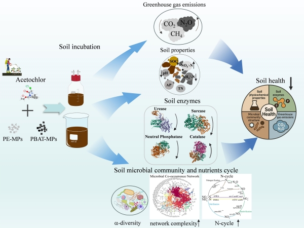 研究发现,微塑料显著加剧了乙草胺对土壤健康的毒性作用,复合污染导致土壤健康下降8.89%-14.63%,远超单一ACT污染的8.39%。MPs/ACT复合污染使土壤pH下降、有机碳(SOC)含量减少3.34%-16.94%、铵态氮(NH4⁺-N)降低15.87%-30.36%。复合污染使脲酶活性增加34.67%-39.77%、蔗糖酶活性提高34.59%-48.67%。复合污染组使CO2累积排放减少3.31%-9.02%,但N2O排放显著增加1.92%-11.05%。复合污染重塑了微生物结构,降低了α多样性,增加了网络复杂性,并富集了污染物降解菌。宏基因组测序进一步表明,复合污染显著影响氮循环和碳循环关键基因。值得注意的是,PBAT/ACT对氮循环的影响比PE/ACT更显著,表明聚合物类型对土壤养分循环具有特异性影响。此外,传统PE微塑料比可降解PBAT造成更严重的土壤健康退化,H-PE/ACT组对土壤健康的破坏最严重(下降14.63%),其次是H-PBAT/ACT组(10.58%)。该研究首次系统阐明了农膜微塑料加剧除草剂乙草胺对土壤健康毒性的机制(图1),揭示了不同类型微塑料的差异化影响途径,为农业生产中微塑料与农药复合污染的风险评估提供了科学依据。
