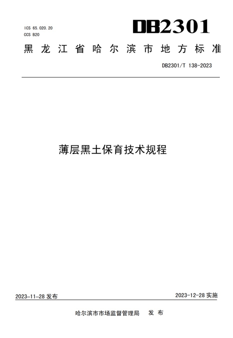 由课题一成员陈旭等起草制定的地方标准《薄层黑土保育技术规程》(DB2301/T 138-2023)已由哈尔滨市市场监督管理局正式发布。此规程于2023年11月28日发布,并于2023年12月28日起开始实施。