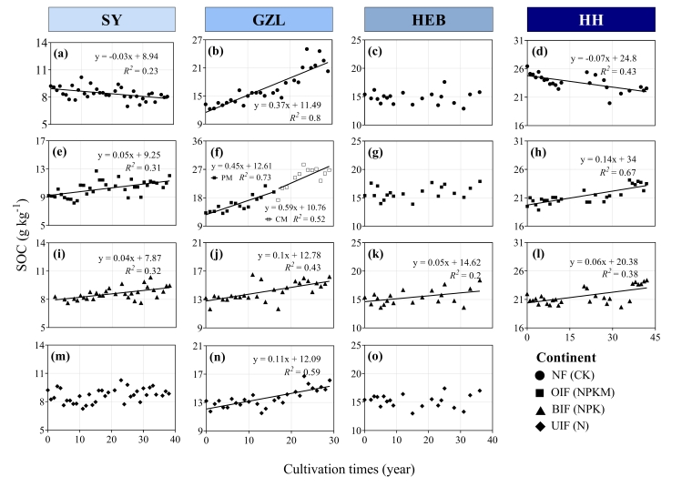 在退化机制层面,研究明确了施肥措施对黑土团聚体稳定性的显著影响,证实有机无机配施及有机物料(秸秆、生物炭)能有效提升稳定性,而不平衡施肥则有负面效应(图4)。对三江平原土壤溶解性有机质(DOM)荧光特征的解析,则从分子层面揭示了高质量土壤有机质具有更高稳定性和腐殖化程度的特征。依托四个长期定位试验,深入揭示了典型黑土及棕壤土壤有机碳(SOC)的时空演变规律及其驱动因素。研究发现,SOC含量总体随纬度升高而增加,但其主控因素(如碳投入、磷循环等)在不同站点和土类间存在差异。不同土壤管理措施影响显著,有机无机配施能有效地促进SOC累积,速率较单施化肥处理提高20-89%(图5)。综合而言,土壤自身性质和区域气候是SOC累积的直接驱动力,而碳投入等农田管理则通过改变土壤性质间接调控。