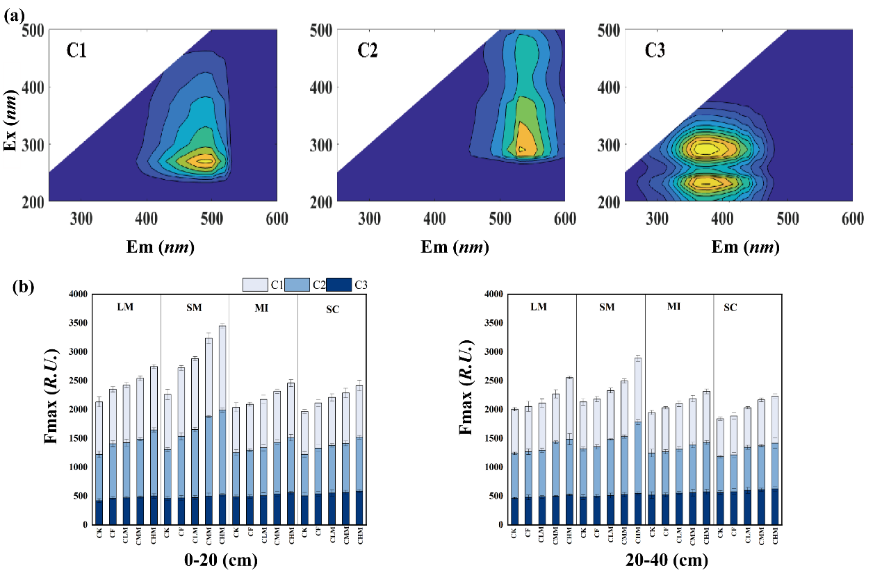 图1. 粪肥配施化肥下土壤团聚体中胡敏酸(HA)的荧光特征变化,基于三维荧光耦合平行因子分析(EEM-PARAFAC)识别到的三种共有荧光组分(a)及各组分的相对强度(b)