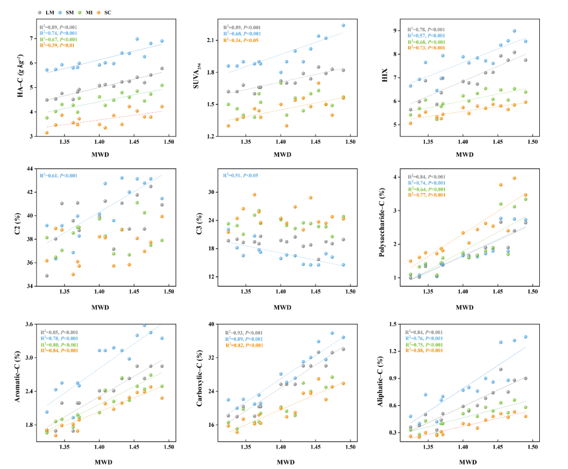 图2. 粪肥配施化肥下土壤团聚体的平均重量直径(MWD)与其衍生的HA不同性质间的线性回归图
