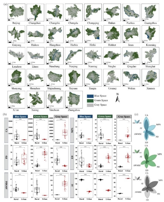 赵淑清研究团队开发了一种可迁移的多尺度高分辨率卷积神经网络,绘制了中国36个主要城市3米分辨率城市蓝绿灰景观数据集,并进一步比较了城市和乡村景观在面积、密度、边缘、形状复杂性、聚集度等方面的差异,揭示了城市环境普遍存在的同质化现象,并进一步强调了这种城市景观同质化对生态系统结构和功能及城市可持续发展所带来的重大挑战。