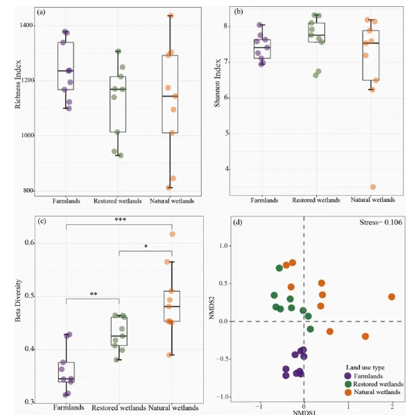 近日,中国科学院东北地理所王国栋研究团队解析了农田、恢复湿地和天然湿地三种土地利用类型中真核生物的alpha 和beta多样性的变化趋势及其驱动机制。研究发现,土壤真核生物的alpha多样性没有显著差异,而土壤真核生物的beta多样性有显著差异,恢复湿地多样性的平均值在自然湿地和农田之间。与恢复湿地和天然湿地相比,农田土壤真核生物群落组成的多样性较低。土壤真核生物群落从农田到天然湿地的共生网络正负边缘比增加,表明恢复过程中物种相互作用增强。结构方程模型表明,物种的正:负相互作用和土壤养分直接影响土壤真核生物的多样性。土壤pH值和土壤含水量通过直接影响物种的相互作用,间接影响土壤真核生物的多样性。研究结果表明,湿地恢复可以改变土壤环境,加强微生物协作能力,增加真核生物的多样性。然而,土壤真核生物结构和多样性要达到湿地水平,可能需要很长时间。