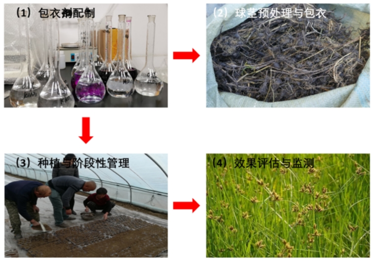 项目组针对性研发了球茎包衣技术,通过采用 10⁶ CFU/mL 枯草芽孢杆菌、0.1%硼肥与0.1%赤霉素混合而成的包衣剂处理球茎,使球茎萌发率从 45% 大幅提升至95%以上,提升率111%,同时种群扩繁速率从 7.0个/株提高到 8.5 个/株,提升率为21%。在环境调控技术上,通过采用行株距 20×15 厘米沟植、覆土 3-5 厘米、初期控水(淹水<5厘米)并进行15-20天精准保湿的方法,实现了单株分蘖≥8个、球茎鲜重≥15克、根系长度≥20厘米的良好效果。通过这些技术的应用,当年植被盖度便达到了45%。