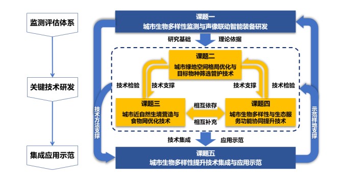 郑海峰研究员牵头负责的“城市生物多样性提升技术与示范”项目针对城市绿地结构单一、景观破碎、管护过度导致生物多样性贫乏、城市生物多样性智能监测不足、食物网结构不完整、生态服务功能低下、生物多样性和生态服务功能不协调等问题,拟在不同气候带典型城市(长春市、北京市、杭州市和海口市)开展城市生物多样性监测技术及声像联动智能装备研发,城市景观格局优化及目标物种筛选管护技术研发,城市绿地近自然生境营造与食物网优化技术研发,城市生物多样性与生态服务功能协同提升技术研发和城市生物多样性提升技术集成与应用示范五个方面内容。该项目由中国科学院东北地理与农业生态研究所牵头,北京大学、吉林大学、浙江大学、北京林业大学、东北师范大学、海南师范大学、浙江农林大学、中国科学院城市环境研究所和中国科学院生态环境研究中心共10家单位参加。