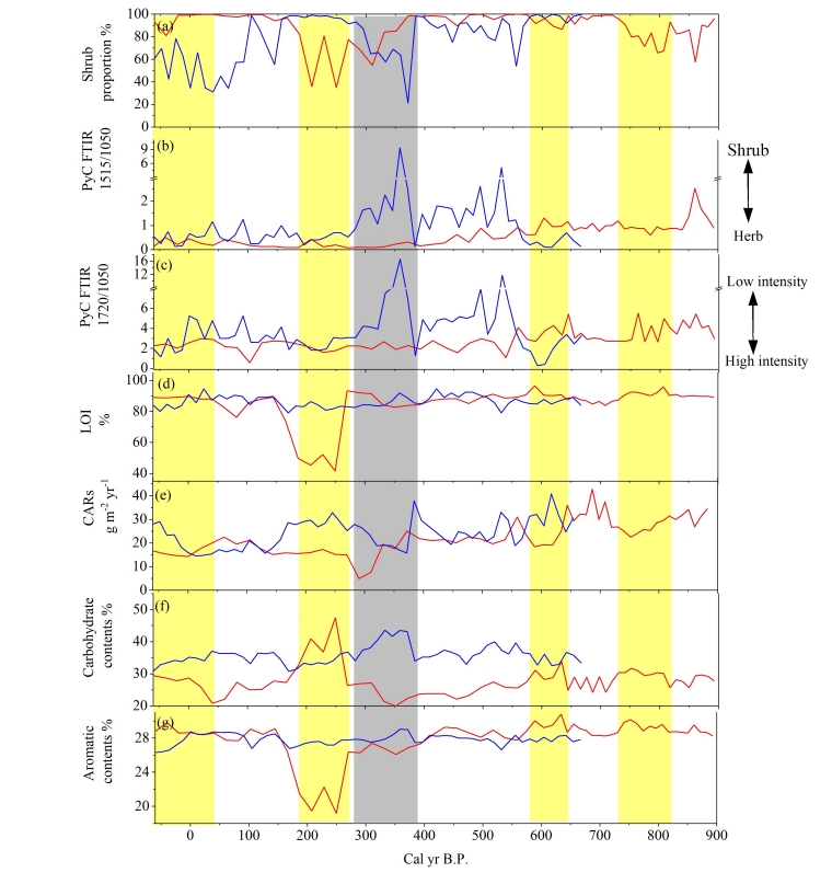 研究发现,灌丛是大兴安岭冻土泥炭地有机质的主要来源。过去千年里,灌丛源有机质在劲涛泥炭地和宏图泥炭地分别占总有机质的88.2±14.6%和78.8±21.5%。中度火扰动的发生提高了灌木源有机质在总有机质中的比例,然而,高强度火扰动将促使有机质的主要来源从灌丛源转变为草本源,特别是在距今300-200年的劲涛泥炭地,并同时明显降低泥炭地土壤碳库的稳定性(图1)。随着多年冻土泥炭地有机质中灌丛源有机质的比例升高,碳累积速率和碳稳定性逐渐升高。随着火烧强度的增加,泥炭地碳累积速率出现先上升后下降的趋势,而碳库稳定性则逐渐升高。综合考虑泥炭地碳累积速率和碳稳定性的变化过程,中等强度的火扰动可以促使泥炭地碳库中累积更多化学稳定性较高的碳,进而更有利于泥炭地在长时间尺度的固碳功能。