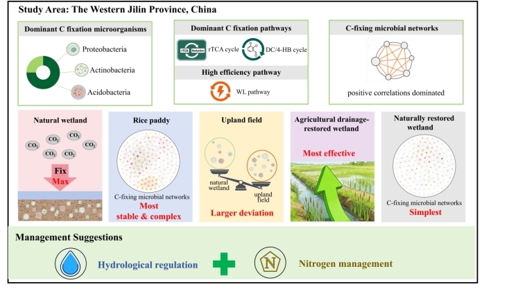 湿地作为全球重要的陆地碳汇,其固碳功能对缓解气候变化具有不可替代的作用。然而,湿地垦殖与恢复如何影响微生物驱动的固碳过程,此前尚缺乏系统认识。为此,研究团队以吉林西部典型苏打盐碱湿地为对象,选取天然湿地、垦殖水田、垦殖旱田、农业排水恢复湿地、自然恢复湿地五种土地利用类型,开展了湿地垦殖与恢复对土壤微生物碳固定影响的系统研究。结果表明,土壤变形菌门、放线菌门、酸杆菌门为该区域土壤固碳优势菌群,还原型三羧酸循环和二羧酸/4-羟基丁酸循环是主导固碳途径;天然湿地土壤微生物固碳潜力最高,是垦殖及恢复湿地的1.30-4.02倍,且稻田土壤微生物相较旱田具有更高的固碳潜力。土壤水分与无机氮含量是调控土壤微生物固碳的核心因子,二者通过影响固碳酶活性、微生物群落及代谢途径,驱动碳固定过程。研究结果为湿地碳汇功能提升与生态修复提供了重要理论支撑。