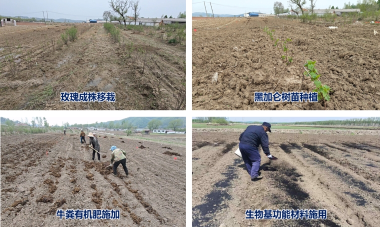 课题组目前已完成种植与管理模式优化试验小区的设计与规划工作,并赴吉林辽河源示范区、黑龙江兴凯湖示范区开展了玫瑰成株移栽工作、黑加仑树苗种植工作、牛粪有机肥施加工作,以及生物基功能材料的施用工作,以强化“基于自然”的景观协调格局耦合“阻控修复”手段的黑土耕地质量提升。