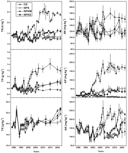 根据长期定位试验土壤养分含量的分析结果(图2),NPKM和NPKS处理中,2022年土壤全氮含量分别为2.4 g/kg和1.6 g/kg,与1989年初始土壤的1.4 g/kg相比,分别提高了71.4%和14.3%。而NPK与CK处理中土壤全氮含量随时间进程无显著变化。在土壤全磷(TP)和速效磷(AP)含量方面,CK处理中,土壤TP及AP的含量随时间呈逐渐下降的趋势,而NPK、NPKS及NPKM处理中土壤TP和AP含量呈逐渐上升趋势,截至2022年,CK处理中土壤TP和AP含量分别为0.6 g/kg和2.3 mg/kg,与1989年相比分别降低了8.4%和80.8%。而NPK、NPKS、NPKM处理中,2022年土壤TP的含量分别为0.9、0.8和1.2 g/kg,分别提高了37.0%、27.9%和95.1%,而土壤AP含量则由1989年的11.8 mg/kg提高至51.5、169.8和34.8 mg/kg。所有处理中土壤TK含量随试验进程均呈现出上升的趋势。