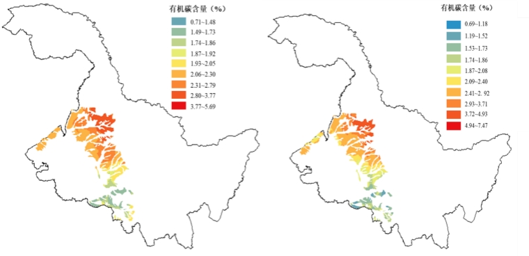 2023年(左)与2002年(右)黑龙江省黑土有机碳空间分布