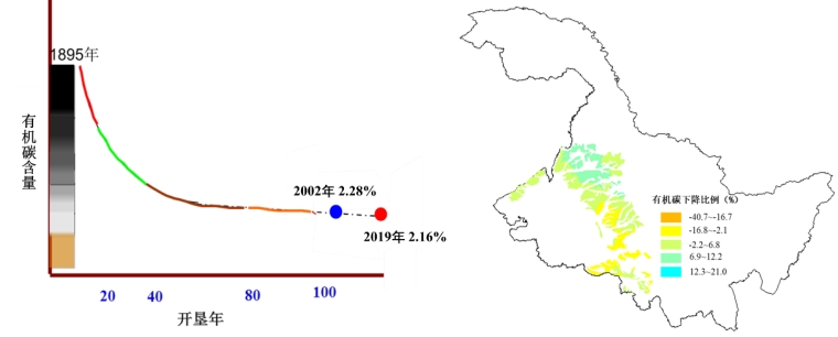 东北黑土存在变“瘦”现象。近60年,黑土耕作层土壤有机质含量下降了1/3,部分地区下降了50%。1980~2011年,东北黑土地是我国旱地土壤有机碳唯一表现为下降趋势的地区,表层土壤有机碳储量每公顷平均下降了0.41t。已有研究表明,黑土地开垦最初20年有机质含量下降约30%,40年后下降50%左右,70~80年后下降65%左右,进入一个相对稳定期。此后黑土有机质下降缓慢,年下降速度低于2‰,每10年下降0.6~1.4 g C/kg。