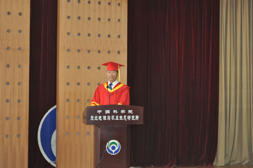 王宗明研究员代表研究生导师讲话,作为我所毕业的年轻一代博士生导师,他跟同学们分享了自己当年毕业典礼时的场景,他的殷殷期盼和句句叮嘱,道出了导师们的心声,看着自己的学生像雏鹰一样的羽翼丰满,即将振翅,导师们盼望你们力争上游,展翅高飞!博士毕业生徐莹莹代表所有毕业生发言,她深情的回顾了求学生涯中的点滴,表达了对东北地理与农业生态研究所的深深热爱、浓浓眷恋以及对导师的无限感激。