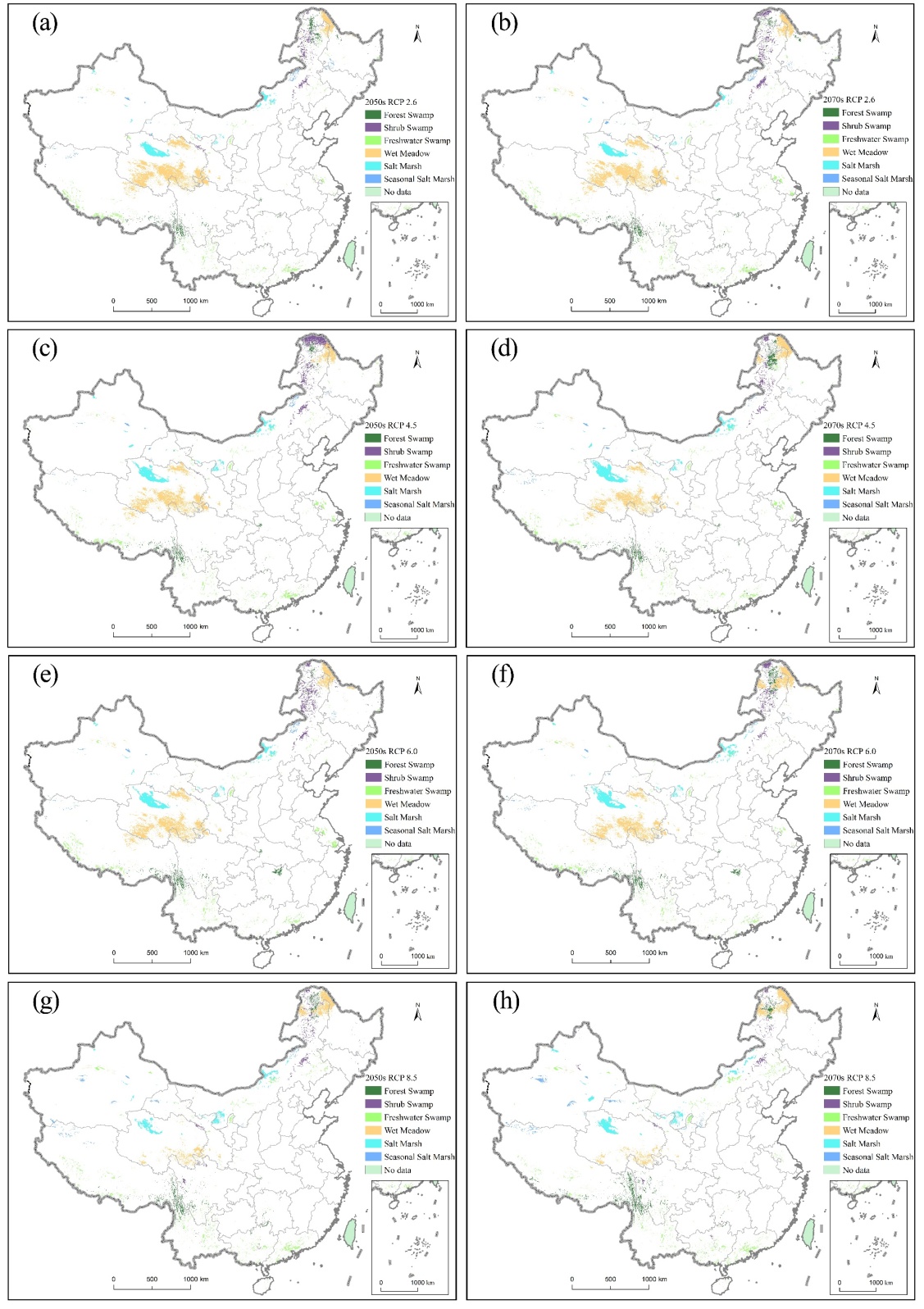 东北地理所研究人员,历时多年调查和数据积累,获取全国湿地类型分布样点数据,结合降尺度高分辨率气候数据、全国耕地数据、夜光遥感数据和人口分布数据,建立了生态位指标数据集;采用生态位分布模型组合预测(ensemble forecasting of niche models)的方法,还原了全新世中期(约6000年前)全国尺度高空间分辨率(1km×1km)自然湿地空间分布;预测了21世纪末期典型气候情景下自然湿地空间分布格局。在此基础上,分析了未来气候变化对湿地生态系统演变的潜在影响和湿地生态系统对社会经济发展的贡献。