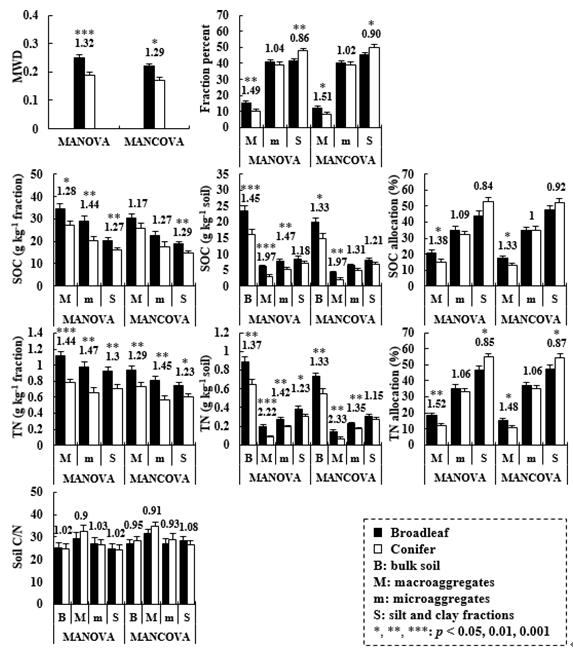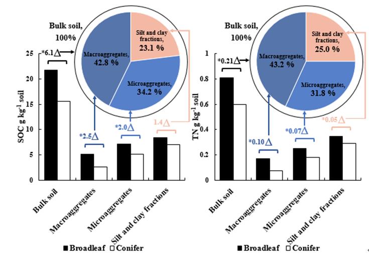 图2. 阔叶林-针叶林土壤组分团聚特性、有机碳以及总氮的差异