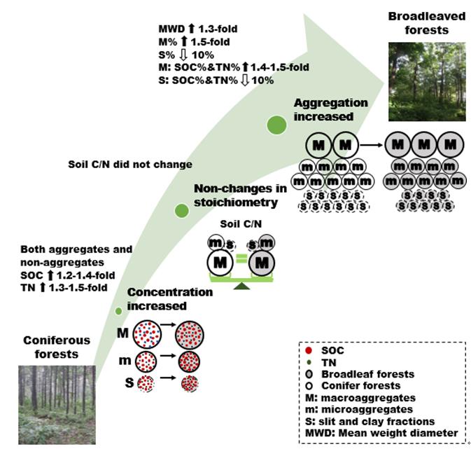 图4. 针叶林转变为阔叶林之后土壤有机碳和总氮累积的3个土壤团聚机制过程