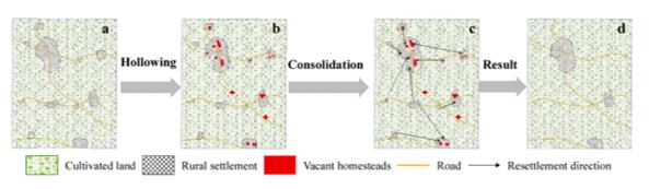 针对乡村居民点“破碎化”和日益突出的村庄“空心化”问题,研究组提出一种在村域尺度上对居民点优化重组的“整小填大”新模式。主要做法是引导长期在城镇居住的农户有偿退出闲置宅基地,将小面积居民点内的农户通过宅基地置换的方式搬迁到大面积居民点的闲置宅基地内,并将小居民点内宅基地全部腾退出来后进行整理和复垦。